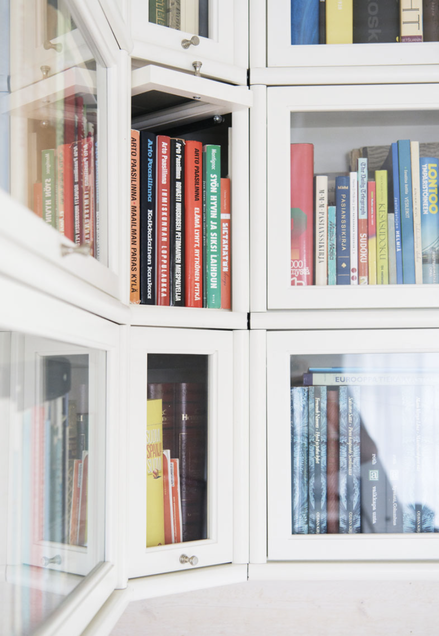 De behändiga gångjärnsdörrarna glider in i skåpet och kan låsas på plats, så att du kan hålla dörrarna öppna om du vill utan att de är i vägen. Du kan placera lådor mellan hyllorna för att hålla ordning på papper och småsaker. Det hela kan också kombineras med ett barskåp eller en sekreterare, det vill säga en arbetsplats med små lådor inbäddade i hyllan. Till montrar finns även LED-belysning som lämpar sig väl för att lyfta fram dekorativa föremål och konst.