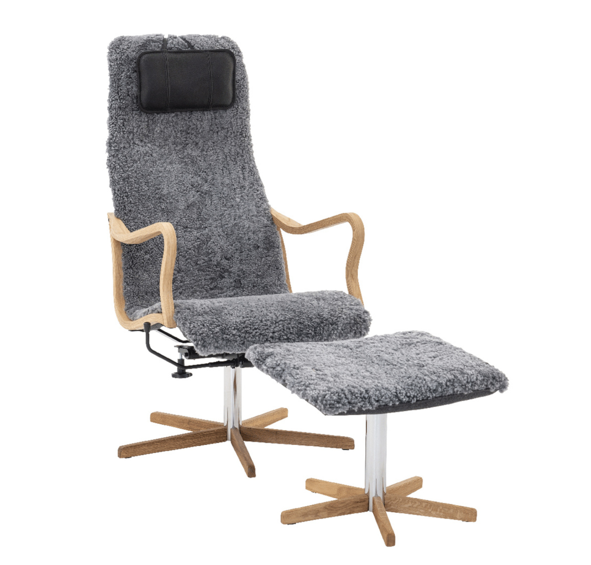 Bröderna Andersson – Chic fåtölj med pall, oljad ek med fårskinn