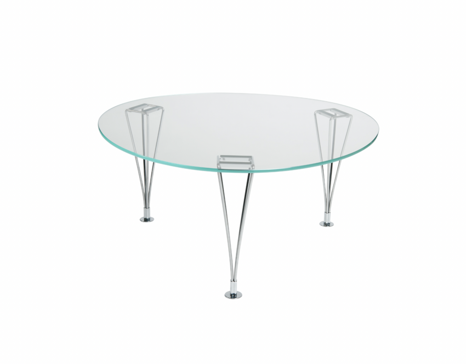 Den karakteristiska bordsskivan är formad som en trisuperellips – en mjukt rundad rektangel med subtilt utsträckta hörn. Formen skapar en harmonisk balans mellan cirkeln och rektangeln, vilket gör att bordet fungerar i många olika miljöer. Glasbordets transparens förstärker känslan av lätthet och rymd, vilket gör det till ett perfekt val för moderna och klassiska interiörer.
