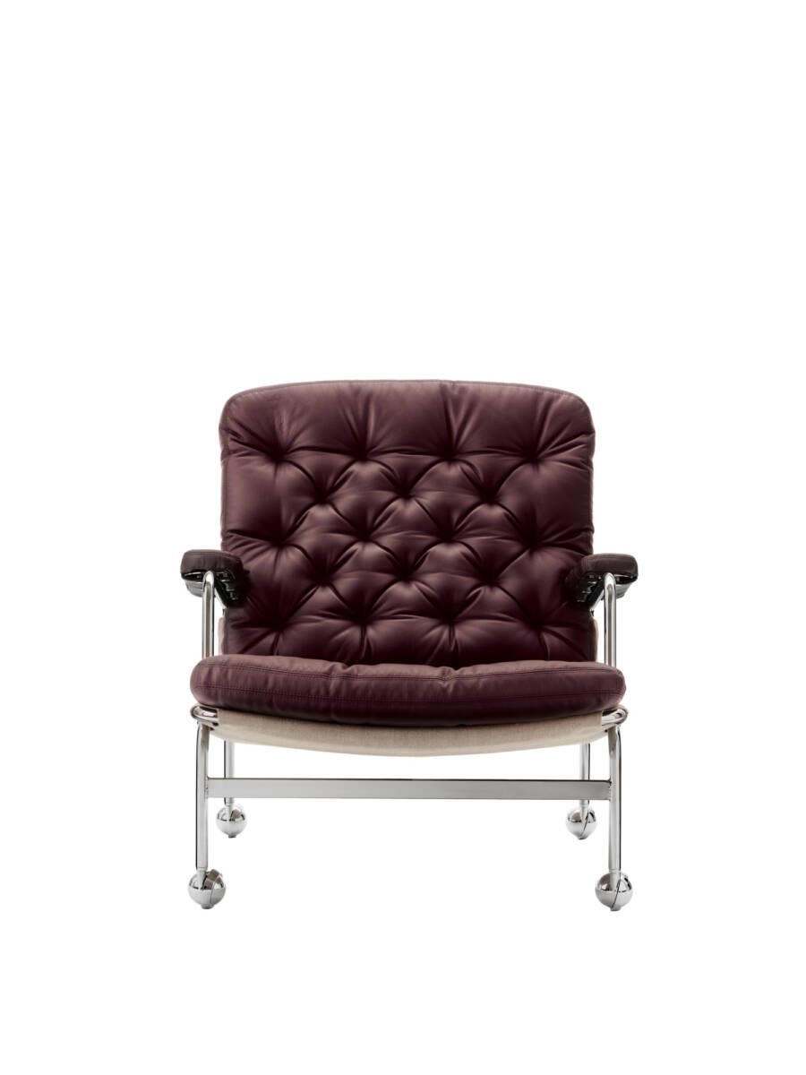 Elegant fåtöljklassiker designad av Bruno Mathsson. Karin 73 är nätt med en ram i fin krom och djuphäftad sits och rygg.