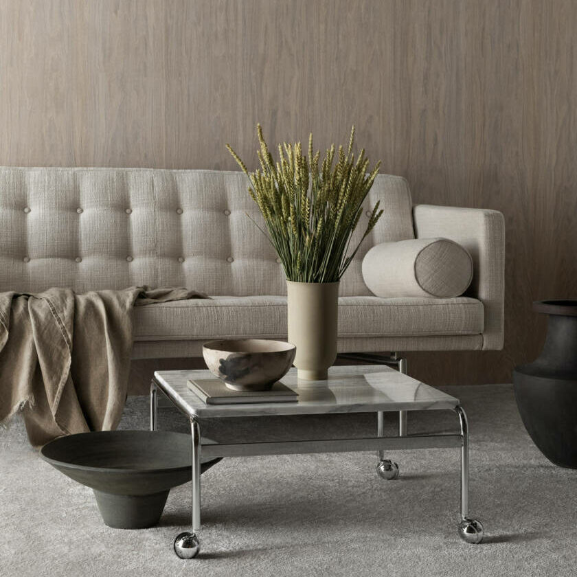 Elegant bordklassiker designad av Bruno Mathsson. Den är tillverkad i vit eller svart marmor. Bruno Mathsson designade bordet som ett komplement till hans klassiska fåtöljserie Karin. Det bär tydlig prägel av seriens formspråk. Bordsskivan är exklusiv carrara- eller nero marquina-marmor. Förkromat stativ. Med hjul