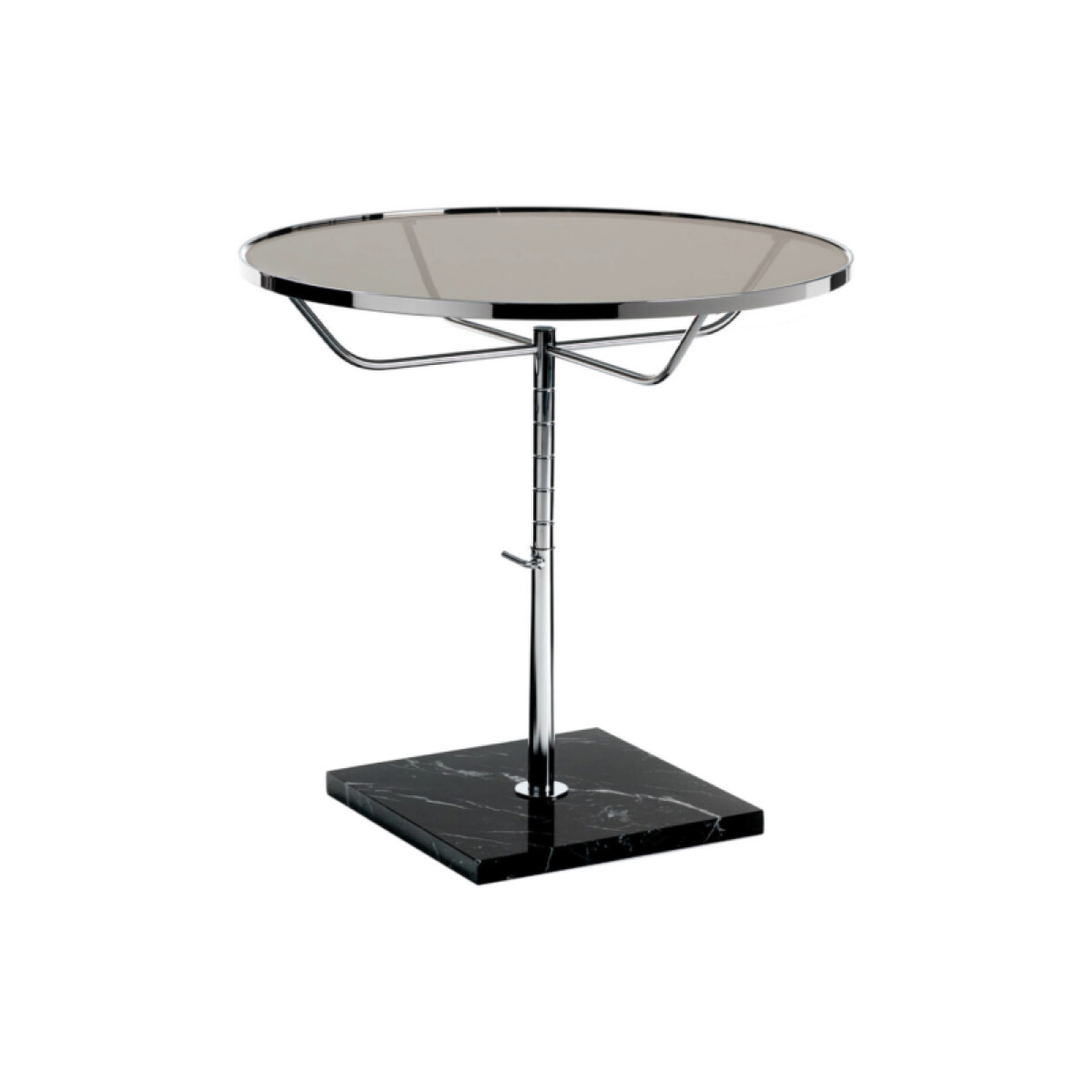 Höjdjusterbart kromat stativ. Bordsskiva i rökfärgat härdat glas. Fot i vit eller svart marmor