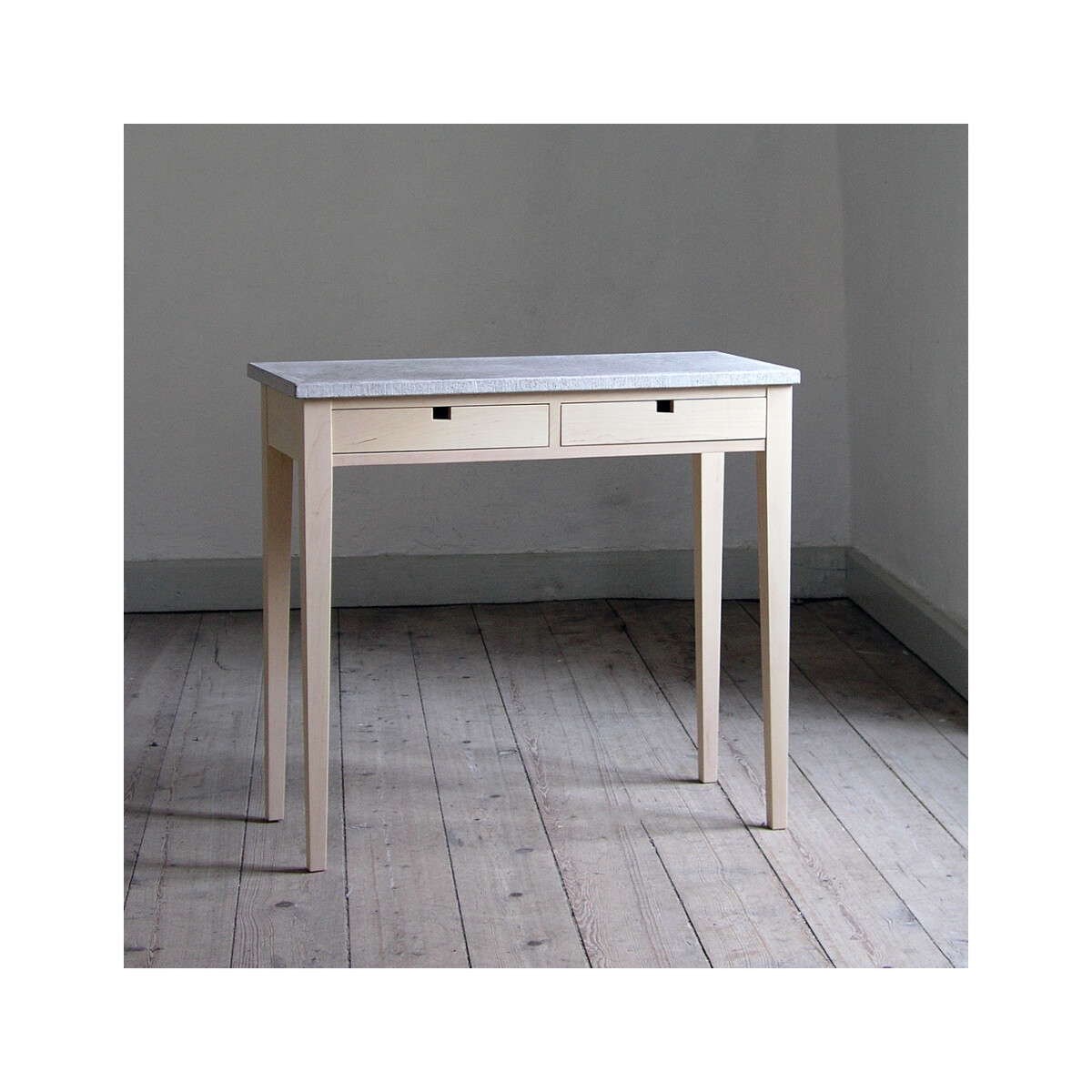 Ala 2 lådor är ett klassiskt litet avställningsbord/skrivbord designat av Kristian Eriksson som tillverkas för hand på Gotland. Skivan finns i björk, ek, gotländsk kalksten eller svart granit. Lådorna med enkelt grepp är sammansatta med halvförtäckt sinkning och vilar på glidlister i bok. Innan möbeln lämnar snickeriet signeras den av ansvarig snickare och märks med datum och ordernummer. Tillval: vitolja på ek, målat underrede med Farrow & Ball.