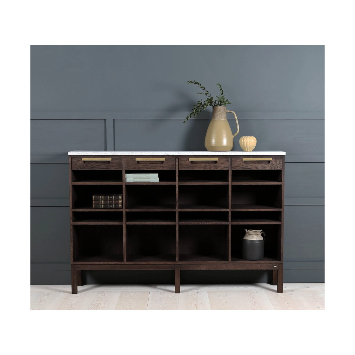 Klinte Skänk #4 toppas med en skiva av mattslipad gotländsk kalksten. Den har 4 sektioner med 3 hyllplan och en låda vardera.