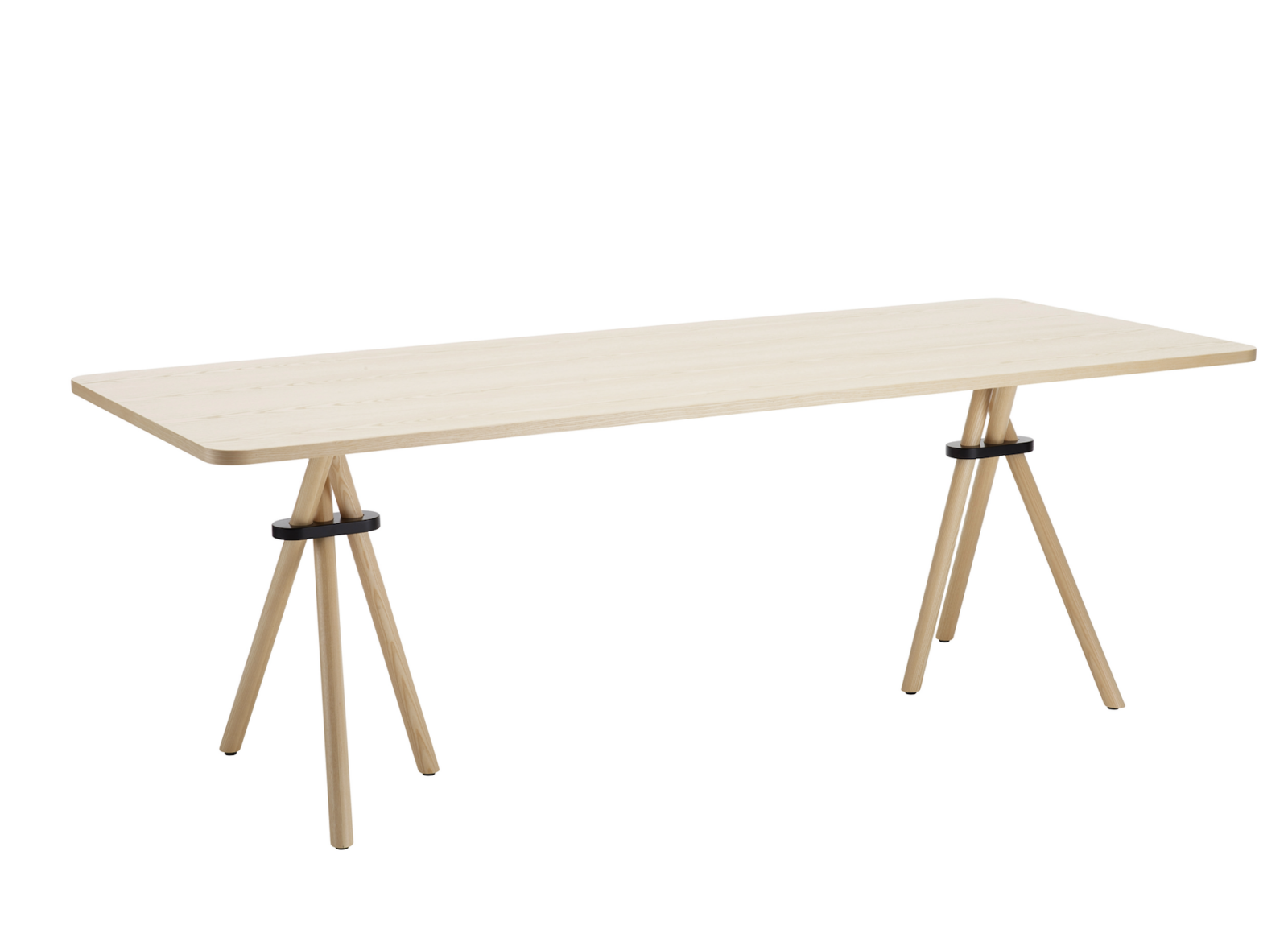 Bordsskivan i fanerad trälamell och benbock i massivt trä med svarlackad knut. Benen har ställfötter. Träslag är ek, björk, ask, standardbetser på ask, vitpigmenterad ek eller ask, laminat (vit, svart) och svart desktop. Kabelgenomföring finns som tillbehör till de rektangulära skivorna. Bordet kan användas som konferensbord, matbord, eller arbetsbord.