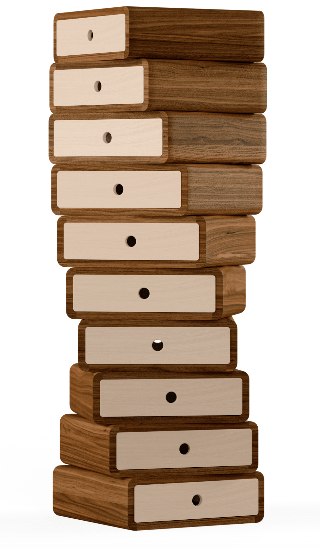 Byrån/Turning Boxes består av 10 lådor, som framför allt kan vridas 360 grader. AK 1020 är en skulpturell och dekorativ möbel som kan ändra sitt uttryck beroende på omgivningen och inbjuder till ett lekfullt förhållningssätt till inredning. Det låter dig skapa en helt unik och funktionell möbel som passar dina individuella behov. Byrån finns i valnöt och lådorna är tillverkade i tvålbehandlad lönn.