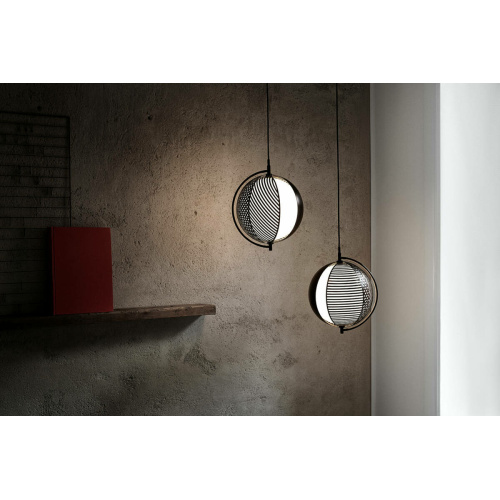 Mondo Large Pendant består av en sfärisk opalglasglob omgiven av fyra rörliga metallskärmar med grafiska mönster.