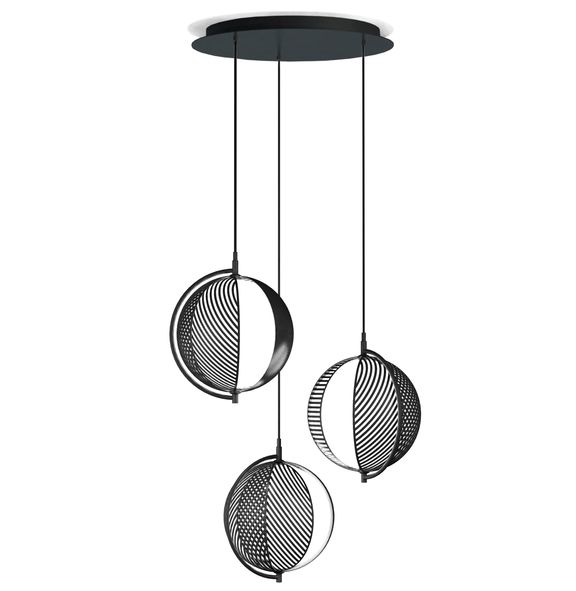 Mondo Triplette är en sammansättning av tre Mondo Pendant-lampor och en takkopp. Mondo är känd för sin tidlösa form och moderna uttryck. Lampan kombinerar en planetarisk design med en abstrakt känsla av originalitet som beror på betraktaren. Möjligheten att interagera med lampan ger användaren möjlighet till oändliga variationer.
