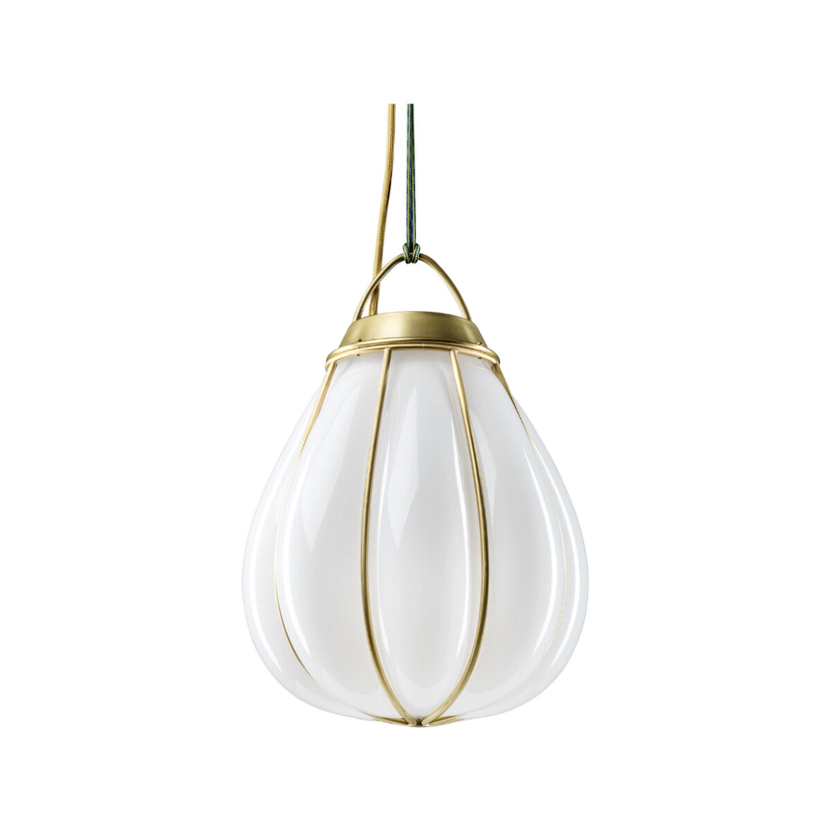 Takkopp och korg i rå mässing. Opalt munblåst glas som formats i korgen. Upphäng i färgat rep. Textilkabel guld. Dimbar. Lampan finns även som golvlampa och vägglampa.