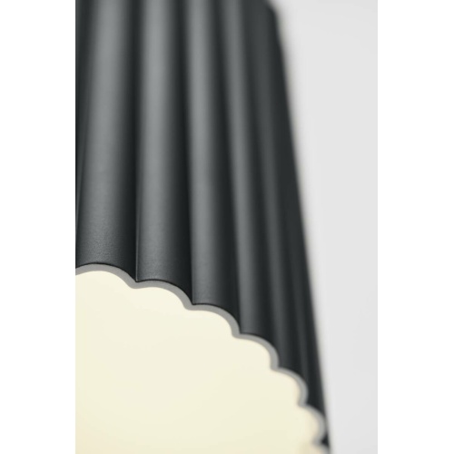Pendellampan Donna projicerar känslan av en mjuk veckad textil, även om den faktiskt är gjord av tunn, lätt aluminium. Dess form är inspirerad av de chica tyger som används på högt mode och utmaningarna med att skapa denna mjukhet med ett hårt material istället för en textil. En vacker och mångsidig pjäs med en uttrycksfull personlighet; lika hemma i alla miljöer.
